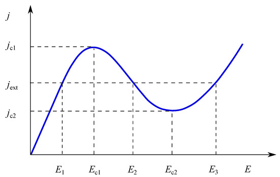 In what follows, only one-dimensional cases will be considered, so I can replace j(E) . Then, by definition, the conductivity . Let us define the differential conductivity as . Thus, the area mentioned above is characterized with a negative differential conductivity. Here, I will not discuss the microscopic mechanisms explaining the negativeness of ; a detailed description may be found, e.g., in Ref. [19]. Further increase in E makes positive again so that the overall shape of the current–voltage curve resembles letter "N”, see Figure 1.