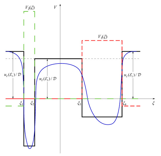 To calculate the matrix elements, it is convenient to single out from the full double-well square potential, , the part corresponding to a single well, i.e., to suppose that , see Figure 4, where for the first well (left side of Figure 4), at , while, at , the sum of and equals the height of the barrier. Similarly, for the second well (right), the sum equals the height of the barrier at , while, at , the potential . Thus, are the single-well potentials, and the corresponding Hamiltonians acting on their wave functions produce zero. Then, the leading terms in the matrix elements are estimated as follows: