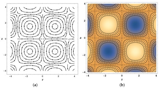 satisfies Equations (15) and (18). Then, the velocity and vorticity fields read, respectively:
