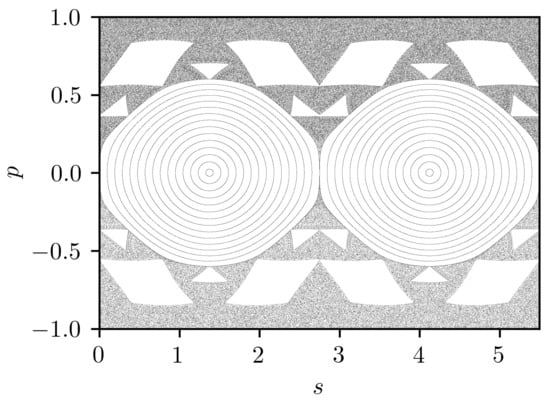 , the Berry–Robnik parameter. Three independent regular island chains are clearly visible, the largest one around the period-2 orbit, which is densely covered by the invariant tori, with no visible thin chaotic layers inside. Let us denote the largest island chain by L, the second largest one by M, and the smallest one by S. The relative phase space volume of all three regular regions taken together is