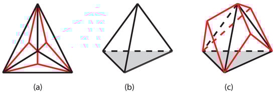 Apollonian network: (a) first (black) and second (black and red) generations of the Apollonian network; (b) first generation of the same Apollonian network represented as a tetrahedron in 3-dimensional space; (c) Apollonian networks of higher generations can be thought of as rooted trees constructed from adjacent tetrahedra. Here, second generation is shown; the shaded face functions as a root of the tree.