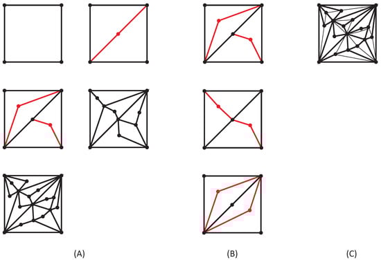 Constructionof a tetragon-based network: (A) representatives of the tetragon-networks up to the 4th generation; (B) three possible topologically different realizations of the second-generation network; (C) random triangulation of the fourth-generation network.