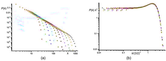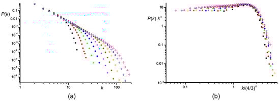 In Figure 6, the numerical data for the degree distribution of the mixed networks are shown. One can clearly see that the slope of the distribution gradually changes with changing p. Moreover, after rescaling the degree distribution with the power law prescribed by Equation (66), all curves are approximately flat for small k, validating the approximation of independent phases.