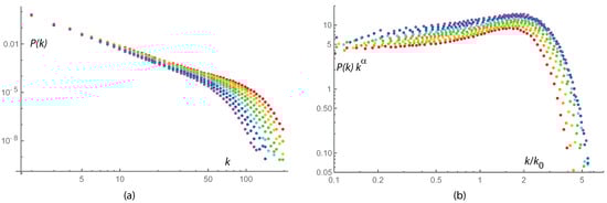 (a) Degree distributions of th-generation mixed tetragon–hexagon networks with varying p, rainbow changing color from (red) to (violet). The results shown are obtained after averaging over realizations and logarithmic binning with step 1.05. (b) Same distributions but rescaled: is rescaled by its theoretical behavior , with given by Equation (66), k is rescaled by a factor , which approximates the growth of the maximal accessible degree with the number of generations n.