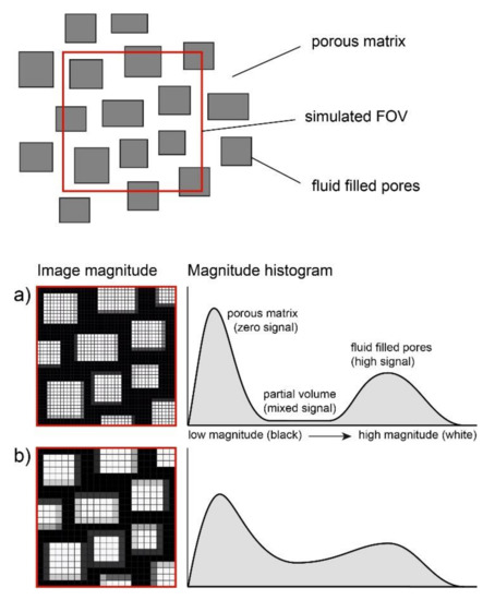 The effect of the voxel size on the distribution of the image magnitude illustrated with a simulated measurement of a porous sample with (a) high resolution and (b) low resolution. ’’FOV’’ stands for “field of view”.