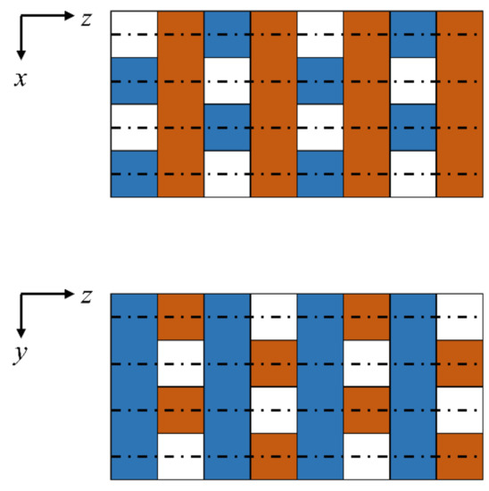 Side views of the layered porous structure in the x-z and y-z planes with dash-dot lines indicating planes of symmetry. Note that the planes of symmetry bisect the pores in lateral directions. In this figure, the parallelepipeds are alternately colored blue and red to indicate the same layers in the two views.