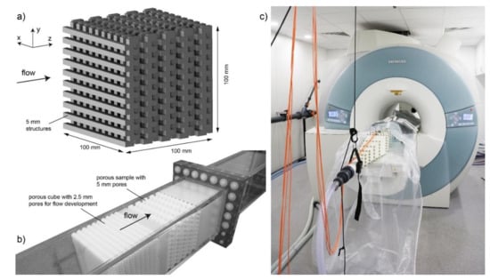 In velocity-encoded phase-contrast magnetic resonance imaging (MRI), which is referred to as magnetic resonance velocimetry (MRV), the pore network structure, including the fluid flow, can be measured at a sub-pore scale [7]. Typical MRV studies of porous media have involved measuring the flow of fluid through packed beds [8,9,10,11,12,13], rock cores [14] and open-celled foams [15].