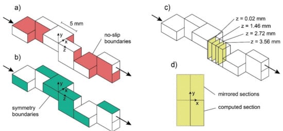The no-slip (zero velocity) boundary condition is imposed on all surfaces corresponding to the fluid–solid interfaces: on the fluid element, these correspond to all the internal faces and one half of the faces at the planes corresponding to the inlet and the outlet. An illustration of the faces of the element that are assigned the no-slip condition is depicted in Figure 4a. Symmetry boundary conditions are implemented on all surfaces corresponding to the planes of symmetry depicted by the dash-dot line of Figure 2. All the outer faces of the representative fluid element correspond to planes of symmetry; thus, the symmetry boundary condition (zero normal flux) is applied on all outer surfaces (depicted in Figure 4b by the green-shaded faces).