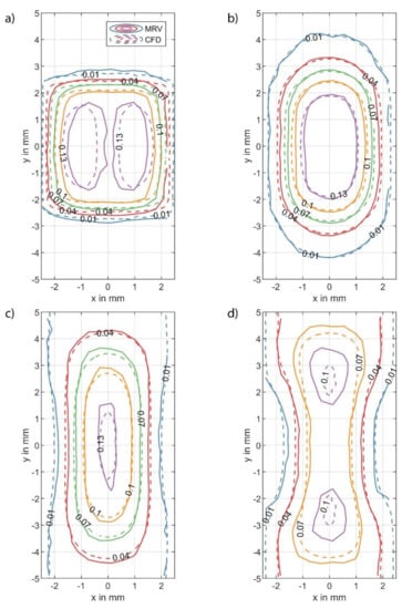 The baseline accuracy of the MRV measurement was examined through a comparison with the CFD results. The MRV data taken from a single pore located within the core region were transformed onto the CFD-coordinate system specified in Figure 4. Experimental and simulation data were taken along planes that represent the same relative pore positions (see the relative planes of Figure 4c). These data were then processed onto the same grid in Matlab 2020b (The MathWorks, Inc., Natick, MA, USA) using the ScatteredInterpolant function. The comparison between CFD and MRV was conducted for the four planes depicted in Figure 4c, which correspond to the following distances from the inlet of the fourth pore layer: 0.02 mm, 1.46 mm, 2.72 mm, and 3.56 mm. The CFD data were mirrored across the symmetry boundaries, as shown in Figure 4d, to reconstruct a full cross-section of the fluid channel. Contours of the axial velocity component (uz) along these specified planes have been plotted in Figure 6 for the MRV results (solid lines) and for the CFD results (dashed lines).