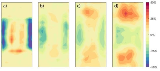 Figure 7 shows the difference in local velocity between the CFD and MRV data as a percentage of the volume average intrinsic velocity (0.0525 m/s). The same planes as in Figure 6 are processed. The highest difference is observed near the inlet in the regions with the highest velocity gradients (see Figure 6a and Figure 7a). The root-mean-square difference of all the depicted data is 12.4% of the volume-average intrinsic velocity.