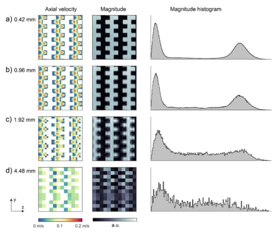 As described in Section 2.1.2, the MRV data were reconstructed with reduced k-space data to produce data sets with a lower resolution. The effect of different voxel sizes is shown in Figure 8. With a lower resolution, the porous structure and the velocity field became less well discretized until a segmentation of the pore network was no longer possible, as shown in Figure 8c,d. Additionally, the same qualitative trend as illustrated in Figure 1 can be observed in the depicted histograms: the relative number of partial volume voxels grows with increasing voxel size, which fills the histogram region between the two signal peaks.