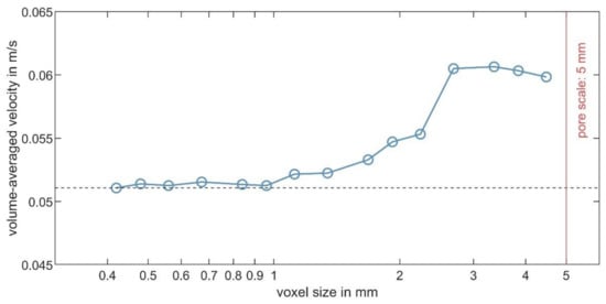 Figure 9 shows the results of Equation (2). It can be seen that with a voxel size below 1 mm, there is a plateau in which the volume-averaged velocity values stay constant. The maximum deviation in this region is only 0.09%. For voxels larger than 1 mm, the deviation increases substantially and reaches 18% for the largest investigated voxel size.