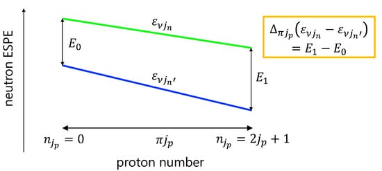 Figure 1 provides a schematic illustration of what is represented in Equation (7). One of the most important properties of is that this quantity does not depend on the choice of the core to define the ESPE. For example, the evolution of the shell gap can be probed not only by the systems with the core but also by those with the core or the core. This means that one can investigate a specific shell evolution for very neutron-rich isotones by using that of less neutron-rich ones, which will be utilized in some cases considered in Section 3.