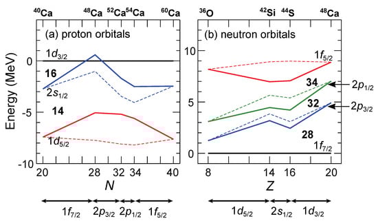 In Figure 2, also the ESPE with the tensor force removed is plotted. One can immediately find that the proton orbital (Figure 2a) and the neutron orbital (Figure 2b) have the largest effect from the tensor force. Since the ESPEs shown are measured from the and orbitals, respectively, this result is a manifestation of a general property that the tensor force strongly affects the spin–orbit splitting (see Figure 1a of Ref. []).