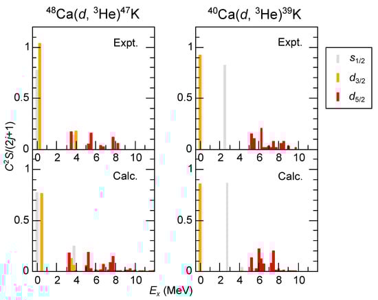 Unlike the cases of and , the proton hole does not appear as a nearly pure single-hole state because the excitation energy is much higher than other low-lying levels, making the hole state fragmented over many levels. For the present purpose, the distribution of spectroscopic factors provides crucial information. The one-proton removal spectroscopic factors from Ca and Ca were measured with reactions, such as (d, He) and . Although the reaction gives more reliable spectroscopic factors, those measured for Ca are concerning only a few low-lying states. Thus, the (d, He) data were used to estimate the spin–orbit splitting for Ca isotopes from the centroid of the measured spectroscopic factors, as discussed in Refs. [,].