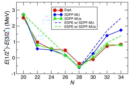 As shown in Figure 4, the measured values are lower than the shell-model results with the SDPF-MU interaction, 1.40 and 1.74 MeV, respectively. Although the calculated levels are located lower than those estimated from the ESPE, 1.71 and 2.50 MeV, respectively; the deviation from the experimental data may indicate the need of refining the monopole matrix elements, related to the shell evolution under discussion.