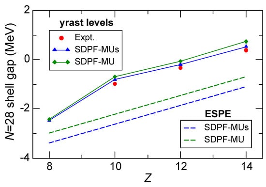 As shown in Figure 2b, the shell gap changes by from to . The - and - pairs are and , respectively, since the tensor force does not contribute to the monopole matrix elements for . As discussed next, the spin–orbit force also adds a negative value for the -, and therefore the shell gap should enlarge. This enlargement is estimated from the yrast levels in Si and S to be MeV. The shell-model calculations with the SDPF-MU interaction lead to MeV, which is somewhat too large.