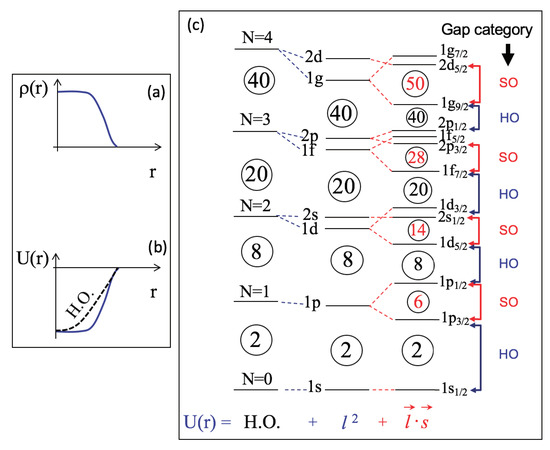 Mayer [1] and Jensen [2] proposed, in 1949, the model of the shell structure and magic numbers of atomic nuclei. This model provided major guides for a deeper and wider understanding of the structure of atomic nuclei. While this is a similar situation to electrons in atoms, there are some differences. Figure 1 depicts the basic idea and consequences of the Mayer–Jensen’s scheme. We start with the nuclear matter composed of protons and neutrons. This matter shows an almost constant density of nucleons (collective name of protons and neutrons) inside the surface, which is a sphere as a natural assumption (see Figure 1a). Because of the short-range character of nuclear forces, this constant density results in a mean potential with a constant depth inside the surface, as shown in Figure 1b. Let us assume that the density distribution is isotropic, producing an isotropic mean potential. Figure 1b also suggests that the Harmonic Oscillator (HO) potential is a good approximation to this mean potential as long as the mean potential shows negative values as a function of r, the radius from the center of the nucleus. We then switch from the mean potential to the HO potential, which is analytically more tractable. Thus, the HO potential can be introduced from the constant density (sometimes referred to as “density saturation”) and the short-range attraction due to nuclear forces.