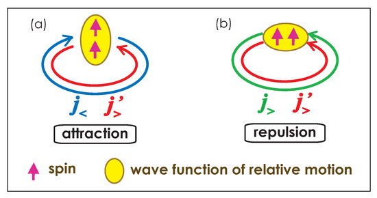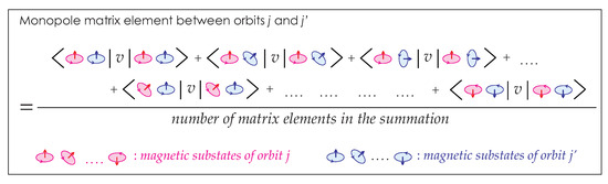 where m and are magnetic substates of j and , respectively, and the summation over is taken for all ordered pairs allowed by the Pauli principle. The monopole matrix element represents, as displayed schematically in Figure 3, an orientation average for two nucleons in the orbits j and . See [15] for more detailed descriptions.