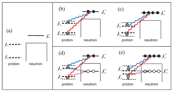 The shell evolution shown in Figure 5b,c are due to the addition of two or four neutrons into the orbit , respectively. Instead of adding, one can put neutrons into the orbit by taking the neutrons from some orbits below , or equivalently by creating holes there, as shown in Figure 5d. If such a lower orbit happens to be the orbit as in Figure 5d, its monopole matrix elements show just the opposite trends compared to the orbit. However, because holes are created in , the sign of the monopole-interaction effect is reversed, and the final effect has the same sign as the monopole effect form the orbit (see Figure 5d). Thus, the particle–hole (ph) excitation of the two neutrons Figure 5d reduces the proton - splitting even more than in Figure 5b. This reduction becomes stronger with the ph excitations of four neutrons, as depicted in panel Figure 5e. Such strong reduction in the spin-orbit splitting produces interesting consequences beyond shell-structure changes. This type of the shell-structure change within the same nucleus is called type-II shell evolution.