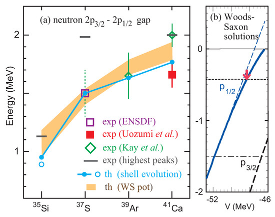 (a) Neutron 2-2 splitting for N = 21 isotones. The symbols are the centroids for 37S [42], 39Ar [50], and 41Ca [50,51]. The horizontal bars are the energy differences between relevant highest peaks [50,52]. Shell evolution predictions are shown by blue closed symbols and the solid line connecting them. The loose binding effect for 35Si is included in the open circle. The calculation with Woods–Saxon potential with parameters adjusted are shown by the yellowish shaded area [50]. (b) Neutron 2 single-particle energy (blue solid line) by a Woods–Saxon potential [12] for varying depth parameter, V. The linear dependence of the deeply bound region is linearly extrapolated (blue dashed line) and is compared to the curved dependence that results from the proximity of the continuum. The dashed line is for the 2 orbit, and the loose-binding contribution to the present splitting appears to be 0.06 MeV against 1.5 MeV splitting itself. Taken from Figure 8 of Supplementary Material of [15].