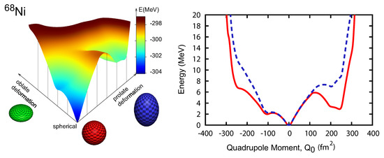 We here quickly overview the quadrupole deformation or the shape deformation from a sphere to an ellipsoid [13]. The quadrupole deformation is driven by the quadrupole interaction, a part of the multipole interaction in Equation (11). The quadrupole interaction is a somewhat vague idea because of a certain mathematical complication, but its main effects can be simulated by the (scalar) coupling of the quadrupole moment operators. If the quadrupole moments are larger, i.e., a stronger quadrupole deformation occurs, the nucleus gains more binding energy from the quadrupole interaction. This is a very general phenomenon, and because of this the ground states of many nuclei are deformed, although 68Ni is not among them.