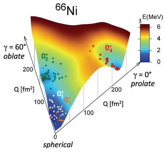 - Leoni, S.; Fornal, B.; Mărginean, N.; Sferrazza, M.; Tsunoda, Y.; Otsuka, T. Multifaceted quadruplet of low-lying spin-zero states in 66Ni: Emergence of shape isomerism in light nuclei. Phys. Rev. Lett. 2017, 118, 162502. [Google Scholar] [CrossRef] [PubMed]