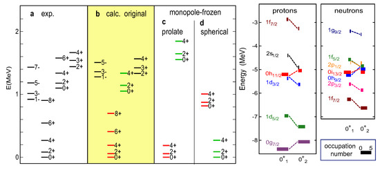 Figure 11 right exhibits the same energy along the axis lines of Figure 11 left, where is varied from −400 fm2 to 400 fm2 while = 0 is kept. The positive (intrinsic) quadrupole moments ( > 0) imply prolate shapes (blue object in Figure 11 left), whereas the negative ones imply ( < 0) oblate shapes (green object). The red solid line shows the CHF results of the full Hamiltonian, whereas for the dashed line, the tensor monopole interactions between the neutron orbit and the proton orbits are practically removed. This removal means no effects depicted in Figure 5d,e. The dashed line displays a less-pronounced prolate local minimum at weaker deformation with much higher excitation energy. The significant difference between the solid and dashed lines suggests that the monopole effects are crucial to lower this local minimum and stabilize it. We now discuss the mechanism for this difference. With the tensor monopole interaction, once sufficient neutrons are in , the proton – splitting is reduced, and this reduced splitting facilitates the mixing between these two orbits driven by the quadrupole interaction. The resulting deformation is stronger compared to no tensor-force case. In parallel to this, the tensor monopole interaction involving the neutron orbit produces extra binding energy, if more protons are in and less are in . This extra binding energy lowers the deformed states, otherwise they are high in energy because of the energy cost for promoting neutrons from the shell to . Thus, a strong interplay emerges between the monopole interaction and the quadrupole interaction, and type-II shell evolution materializes this interplay in the present case. It enhances the deformation and lowers the energy of deformed states. Without this interplay, as indicated by blue dashed line in Figure 11 right, the rotational band corresponding to the local minimum is pushed up by 4 MeV and may be dissolved into the sea of many other states. It is obvious that this interplay mechanism works self-consistently.
