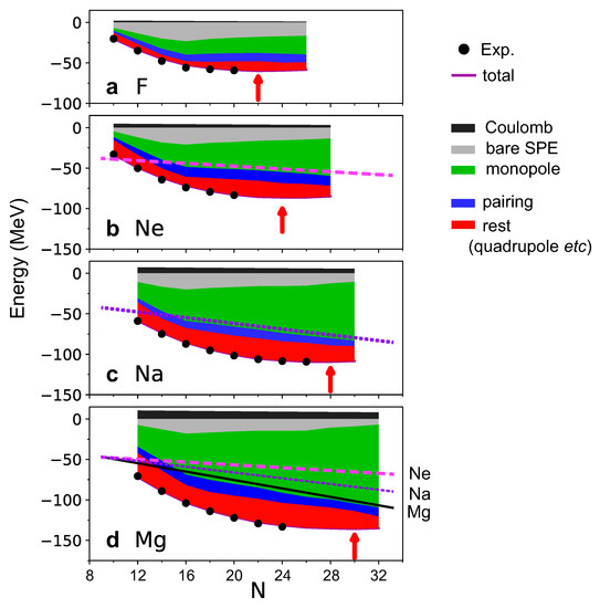 - Otsuka, T.; Shimizu, N.; Tsunoda, Y. Moments and radii of exotic Na and Mg isotopes. Phys. Rev. C 2022, 105, 014319. [Google Scholar] [CrossRef]