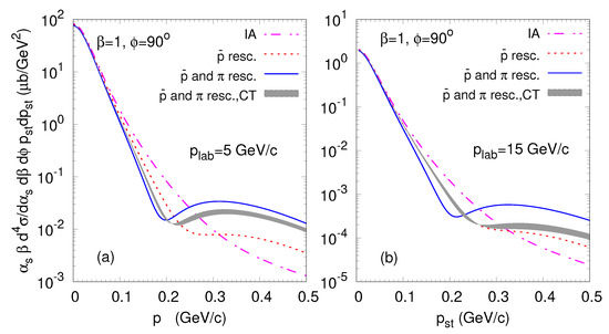 c, the rescattering is stronger at the same angles. This behavior can be understood from the structure of the exponents in the amplitude with pion rescattering, as seen in Equation (