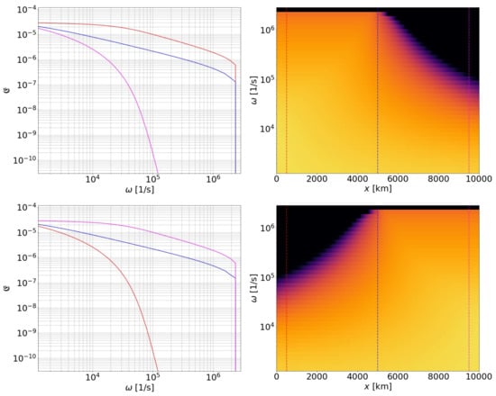 The assumption of broadband wave emission is not based on a particular physical model of Alfvén wave generation in the footpoints of the coronal loop. To note, however, is that similar modelling has been applied, e.g., in connection with cyclotron heating on open field lines; see, e.g., [34,35]. Additionally, the observed heliospheric turbulence evolution suggests a broadband power spectrum of the form , identical to those considered here at low frequencies, being eroded by turbulent processes (see, e.g., [36]). The heliospheric fluctuations are, of course, observed at lower frequencies but the spectrum below the correlation scale still spans several orders of magnitude. Thus, we regard the assumption of broadband wave emission from the footpoints of the loop as a reasonable, albeit not the only possible, assumption.