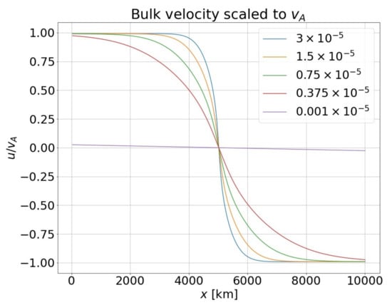 The calculated bulk velocity of energetic particles normalized to the Alfvén velocity in simulations of a coronal loop with the size L = 10,000 km and the spatial cell size km. Different normalization values are denoted in the legend.