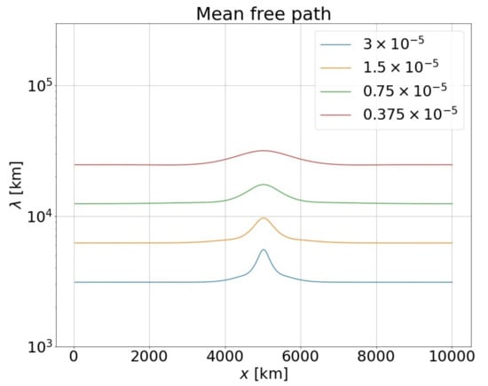 The calculated mean free path of particles in simulations of a coronal loop with the size L = 10,000 km and the spatial cell size km. Different normalization values are denoted in the legend.