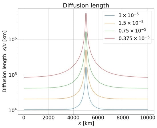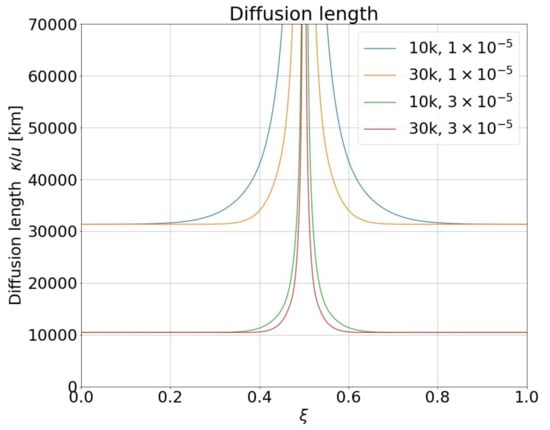 The calculated diffusion lengths of energetic particles for simulations of a coronal loop with the size L = 10,000 km and the spatial cell size km. The curves are cut off to avoid presenting the diverging values of the diffusion length in the middle. Different normalization values are denoted in the legend.