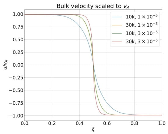 To investigate the evolution of the particle transport properties, analyses of the bulk velocity, mean free path, and diffusion length were conducted on the 30,000 km loop with injection normalization parameters and to the 10,000 km loop with identical injections. The results are presented in Figure 7, Figure 8, Figure 9 and Figure 10, where the particle transport coefficients are plotted along the dimensionless spatial coordinate . The curves, representing the spectra, given in Figure 2 and Figure 6, lie on top of each other, as expected. The other cases are ordered so that the higher injection spectral energy density corresponds to the steeper gradient of the bulk speed. The case with a longer loop and higher spectral energy density of the waves now demonstrates a regime where the loop length exceeds the diffusion length and the turbulent trapping of protons in the loop apex seems plausible.