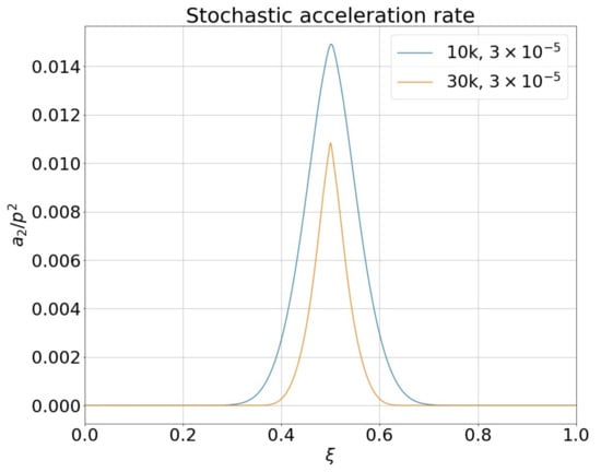 The loop apex is also a potential location for second-order Fermi acceleration, as waves propagating in both directions along the field are present there. Thus, the rate of stochastic acceleration of particles (Figure 10) is also investigated. Let us define it using the coefficient of momentum diffusion (Equation (9)), as , where p is the particle momentum i.e., is the time scale needed for the particles to diffuse a “distance” p in momentum space. The values for the second-order Fermi acceleration rate displayed in Figure 10 are visibly lower than the rate of the first-order Fermi acceleration, s.
