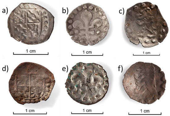 - Beck, L.; Alloin, E.; Michelin, A.; Téreygeol, F.; Berthier, C.; Robcis, D.; Borel, T.; Klein, U. Counterfeit coinage of the Holy Roman Empire in the 16th century: Silvering process and archaeometallurgical replications. In Der Anschnitt. Beiheft 26: Archaeometallurgy in Europe III; Hauptmann, A., Modarressi-Tehrani, D., Eds.; Deutschen Bergbau-Museum Bochum: Bochum; Germany, 2015; pp. 97–106. Available online: https://www.academia.edu/14279648 (accessed on 24 February 2022).