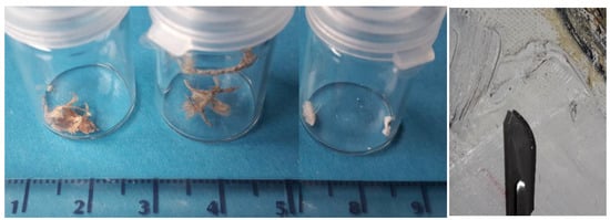 Different materials were sampled (Table 2): wood from the stretchers, fibers from the canvases, and paint (Figure 2). Fibers were previously identified as natural fibers under the microscope [12]. The paint sample was analyzed by X-ray diffraction (XRD), showing the presence of BaSO4, ZnO, and CaCO3-containing pigments in an organic binder.