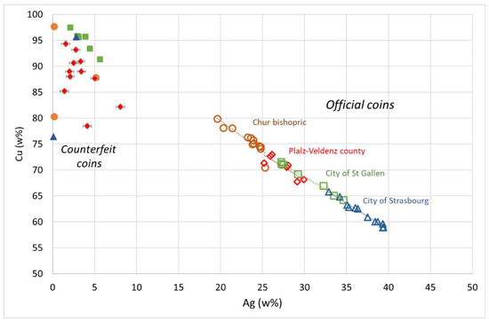 Silver vs. copper contents (in wt%) for selected coins of the Preuschdorf hoard coming from the cities of Strasbourg and St. Gallen, the county of Pfalz-Veldenz, and the bishopric of Chur. Open symbols correspond to official coins, and filled symbols correspond to counterfeit coins.
