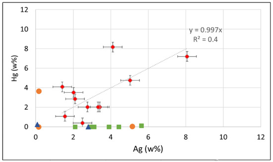 The counterfeit coins are characterized by their low content in silver (less than 8%) and high content in copper (from 76 to 98 wt%). The values are scattered due to the variable presence of other elements such as mercury, zinc, and tin. Mercury is detected in the counterfeit coins imitating those of the county of Palatinate (Pfalz-Veldenz, (catalogue number 104.F; see Table 1)), in one coin copying that of the city of Strasbourg (151.F), and in another copying that of the bishopric of Chur (188.F). Mercury is clearly correlated to silver (Figure 4), suggesting the presence of an Ag-Hg alloy at the surface of the coin. The mean ratio between silver and mercury is about 1, corresponding to a layer composed of 50% Ag and 50% Hg. However, a large scatter is observed from one coin to another, with ratios from 1.6 to 0.3, corresponding to compositions of ~62% Ag and 38% Hg to 25% Ag and 75% Hg.