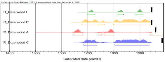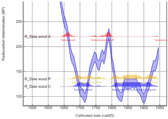 14C accelerator mass spectrometry (AMS) dating results of the wood samples taken from the painting stretchers. Uncalibrated radiocarbon ages are reported in years Before Present (BP), i.e., in years before 1950. Calibrated dates are obtained by calibrating the radiocarbon ages using the Intcal20 atmospheric curve [26] (Figure 7).