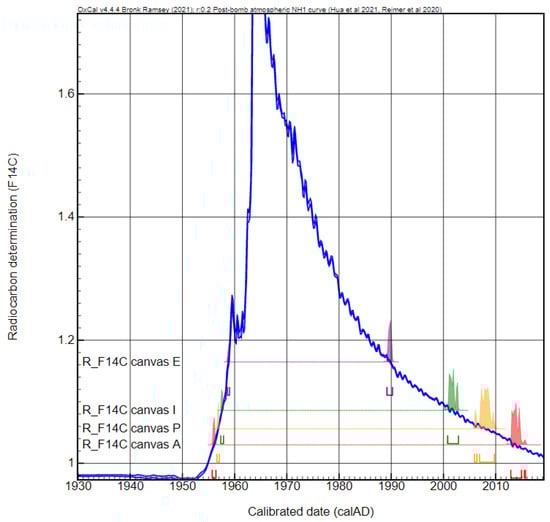 Calibration of the fiber samples taken from the canvas of the Impressionist, Pointillist, Abstract, and Expressionist paintings. The blue curve is the post-bomb atmospheric calibration curve (Bomb13 NH1) used to calibrate 14C dates after 1950 [25,26,27]. See text for details.