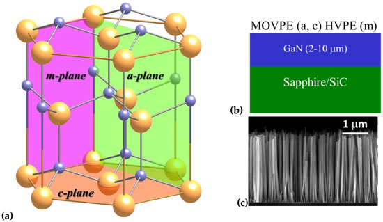 Group III nitride semiconductors, namely, GaN, AlN, InN and their ternary and quaternary compounds, became famous beyond the research community due to their application in light-emitting diodes (LEDs) and laser diodes for lighting and data storage. Their fame culminated in the attribution of the Nobel Prize in Physics in 2014 to Isamu Akasaki, Hiroshi Amano and Shuji Nakamura for the development of the blue light-emitting diode (LED) in the 1990s [1]. Today, nitride LEDs are the base technology for highly efficient white solid-state lighting and advanced photonics applications [2]. Many of these new applications rely on non-conventional structures, such as those incorporating non-polar nitrides (i.e., with a- or m-plane surface instead of the conventional c-plane structures) or nanowires (NWs) [3,4,5]. In this context, non-polar devices avoid efficiency losses due to the quantum-confined Stark effect. The electrical fields induced in c-plane quantum wells due to the polar crystal structure, reduce the electron–hole overlap and, thus, the probability of radiative carrier recombination, in particular, for long-wavelength emissions in the green and red spectral regions [6]. The advantages of devices based on NWs include their high crystalline quality compared to heteroepitaxial layers since the 3-dimensional (3D) structures allow for efficient strain relaxation minimizing the number of dislocations, as well as improved light extraction [7].