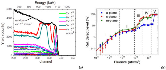 The curves are well fitted (lines in Figure 2b) using the defect accumulation and amorphisation model by Hecking [49]. According to this model, the linear increase of damage in regime I is due to defect formation in well-separated collision cascades. In regime II, the individual collision cascades start to overlap, leading to an increased recombination of vacancies and interstitials and an almost stable defect level. In regime III, the formation of extended defects and clusters leads to a strong increase in the defect level, which saturates again in regime IV. A full loss of the single crystalline order is observed in regime V for very high fluences above 1 × 1016 at/cm2. Similar curves were measured by several groups in c-plane GaN and AlGaN [38,50,51], nevertheless, it should be noted that, in some cases, chemical effects, as well as cascade density, can considerably change the defect accumulation in GaN [36,52,53].