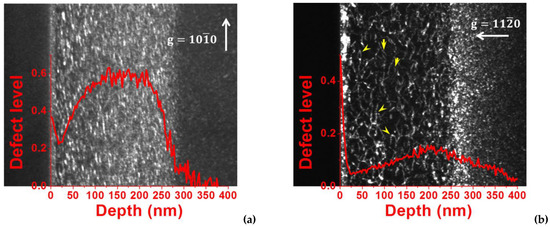 To differentiate between these two scenarios, TEM was performed on samples corresponding to regime IV, implanted using a fluence of 8 × 1015 at/cm2. Examples for TEM images of c- and a-plane samples are shown in Figure 3. They reveal that indeed the nature of extended defects is different in the two samples. While basal stacking faults, with the typical light contrast parallel to the surface (Figure 3a), are dominant in c-plane GaN, a-plane GaN shows a high concentration of dislocation loops with a [110] character (Figure 3b). The defect profiles derived from RBS/C were superimposed onto the TEM images and show a good agreement with the observed contrast for the m-plane sample. For the a-plane sample, pronounced surface damage was identified using both techniques. In deeper regions, TEM shows a layered structure with dislocation loops clearly observed until a depth of approximately 250 nm, while the region between 250 and 350 nm depth shows the typical contrast of defect clusters. This distinct defect morphology is not resolved in the RBS/C spectra. The extracted defect profile corresponds to atoms that are displaced from their lattice sites. These displaced atoms, mainly due to defect clusters, lead to direct backscattering of the alpha particles, while the distortion of the lattice by dislocation loops gives rise to a high dechannelling yield. In future work, it will be interesting to implement a model for these defects in a Monte Carlo code, which would allow for a more quantitative analysis of RBS/C spectra in the presence of different defect morphologies [57]. Nevertheless, the depth range at which defects are visible was the same for both techniques. It is worth mentioning that a similar layered structure was observed using TEM in ion-implanted c-plane GaN, where stacking faults were formed at the depth of nuclear energy deposition, while deeper regions were free of stacking faults but instead present defect clusters [58].