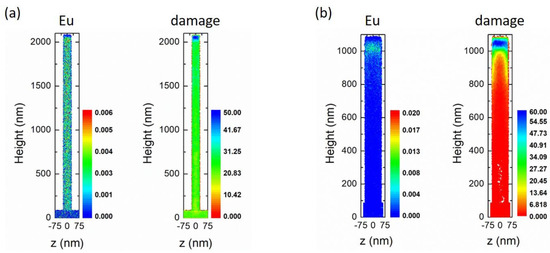 The distribution of Eu ions and implantation defects in NWs is more complex than in thin films. The results of Monte Carlo simulations, showing the Eu and defect distributions after implantation of 3 × 1015 at/cm2, are presented in Figure 4 for two different types of NWs: (a) 50 nm diameter and an areal density of 2 × 109 cm−2, and (b) 100 nm diameter and an areal density of 7 × 109 cm−2. It is clear that the final distributions depend critically on the density of the NWs and their diameter. In particular, the side facets are shadowed by surrounding NWs and the distribution of ions and defects with respect to the NW axis depends on the NW diameter. For the same implantation parameters, the first case of thinner and less dense NWs (Figure 4a) leads to homogeneous doping and defect formation in the entire NW. In contrast, for the second case of thicker and denser NWs, Eu and damage distributions are less homogeneous. In the latter case, Eu ions are confined to the top ~500 nm. A high Eu concentration is found in the top 100 nm of the NW due to ions entering through the top surface. A similar doping depth is expected for the simultaneously implanted GaN thin films. The ion range measured from the lateral surface of Eu entering through the side facets is smaller than the radius of the NWs leading to low Eu and defect concentration near the NW core and higher concentrations close to the rim.
