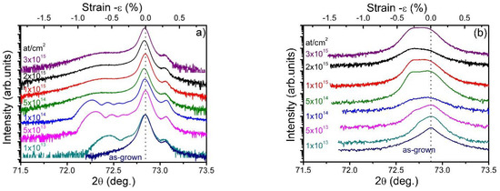XRD 2θ−θ scans of the 0004 reflection (with θ being the Bragg angle, i.e., the angle between the incoming beam and the diffracting crystal plane) for GaN thin films and NW samples implanted using different Eu fluences are presented in Figure 5a,b, respectively [45]. The position of the main Bragg peak, corresponding to the c-lattice parameter of the as-grown material, is marked by a dotted line. It is also seen in all implanted samples arising from the unimplanted deeper layers of the crystals. For the thin films, ion implantation leads to the formation of a satellite peak at a smaller 2θ angle than the main Bragg peak. This satellite peak reveals an expansion of the c-lattice parameter of the wurtzite structure due to strain caused by the implantation defects. With increasing ion fluence, the satellite peak shifts to lower angles/higher strain until, above a fluence of 5 × 1014 at/cm2, the XRD pattern remains unchanged. In this regime, the scattered intensity is very low due to the heavily damaged crystal and the XRD technique becomes insensitive to further defect formation. The maximum strain values measured in these thin films are around 1.5% (see the upper x-axis scale in Figure 5a).