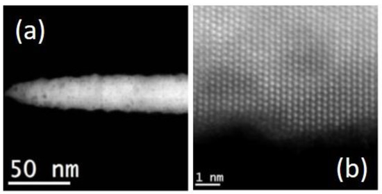 TEM high-angle annular dark-field (HAADF) images of a single NW implanted using a fluence of 1 × 1015 at/cm2 and annealed at 1000 °C are shown in Figure 6.