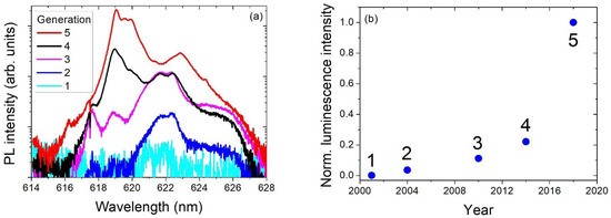 Concerning thermal annealing, it soon became clear that high annealing temperatures are the key to efficient optical activation of Eu3+. However, without appropriate protection of the surface, nitrogen starts to out-diffuse at temperatures above 800 °C, leading to the dissociation of GaN [69]. Indeed, using simple protection by applying a proximity cap (i.e., placing another GaN sample face to face with the implanted sample) and low-pressure N2 annealing atmospheres, the maximum achievable temperature was ~1000 °C [70,71]. Further research on different annealing conditions and surface protection led to several new “generations” of GaN:Eu samples with an intensity increase of the Eu3+ emission of three orders of magnitude. Figure 7 gives an overview of the photoluminescence spectra and emission intensity of these various sample generations. Generation 1 corresponds to Eu-implanted GaN annealed in N2 at ambient or low pressure. In these conditions, both furnace annealing and rapid thermal annealing can be performed up to a maximum temperature of about 1000 °C [71].