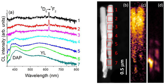 (a) Nano-cathodoluminescence (CL) spectra taken at seven points from the top (1) to the bottom (7) of a single NW implanted using a fluence of 1 × 1014 at/cm2 (20° incidence angle) and annealed at 1000 °C. The regions where the spectra were taken are indicated with red rectangles in (b). ‘’DAP’’ denotes donor–acceptor pairs and ‘’YL’’ stays for yellow luminescence. (c,d) Luminescence intensity maps integrating the spectra in a wavelength region around the 622 nm Eu3+ line (c) and from 350 to 550 nm (d). Adapted with permission from Ref. [45].